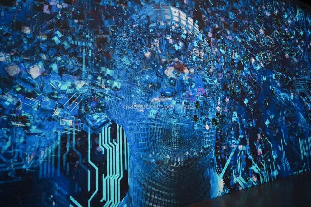 続く部屋では、四方の壁に投影された映像展示があり、「今後どのような未来を目指すべきか」という問いかけがなされます。