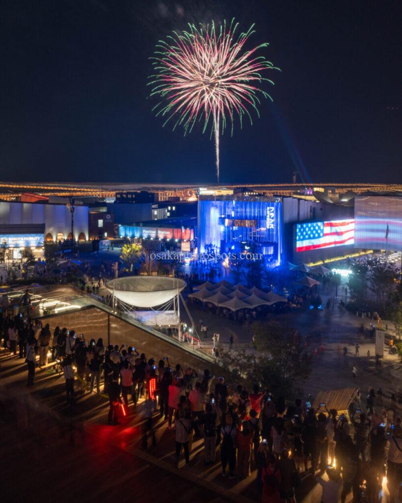 いよいよ花火の撮影です。万博では三脚の持ち込みが禁止されているため、手すりにリュックを置き、その上にカメラを固定して撮影する方法を採用しました。