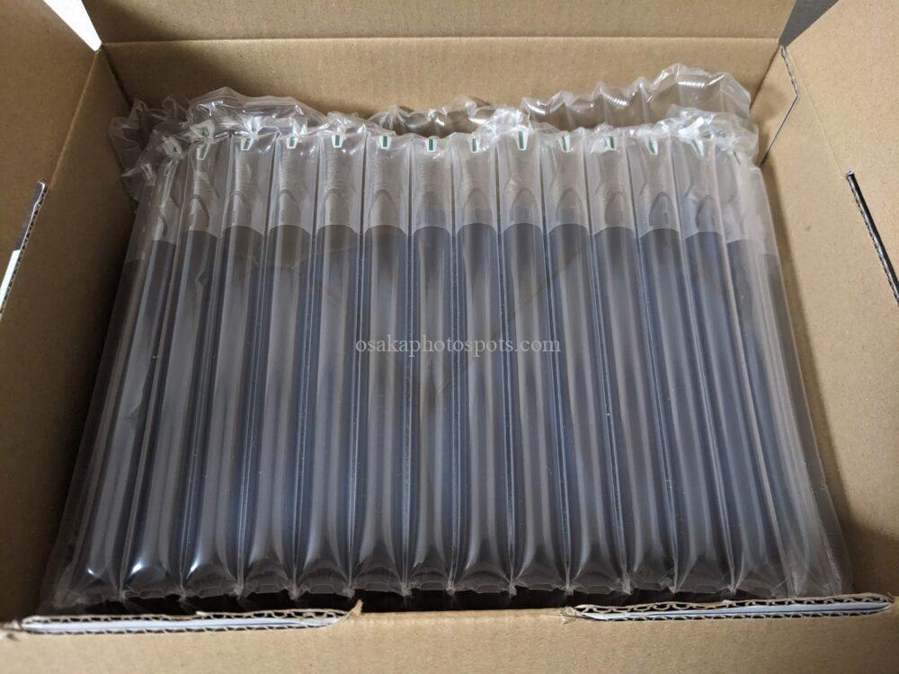 カメラやレンズは高額な精密機器なので、当然といえば当然ですが、しっかりした段ボールにエアーの梱包材、さらに保護用のラッピングクロスが機材に巻きつけられていました。