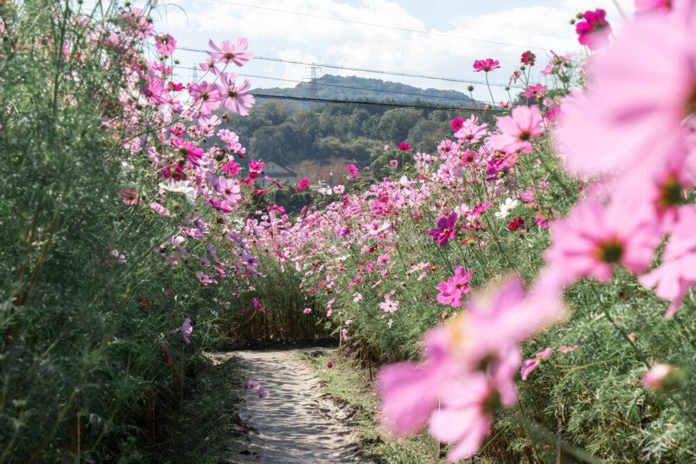 日根荘大木の里 コスモス園では、例年10月ごろにコスモスが見頃を迎え、見頃に合わせて開園します。犬鳴山へと向かう道の途中にあり、バスまたは車でのアクセスが可能です。