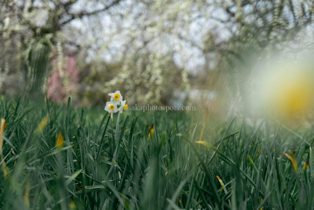 また、同じ場所に日本水仙が植えられています。通常1月~2月が見頃のため、梅とは見頃がズレていますが、年によっては、どちらも見頃の状態で撮影できます。
