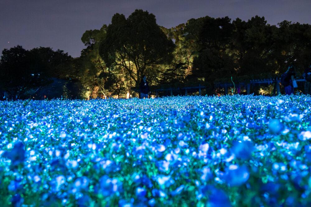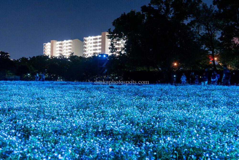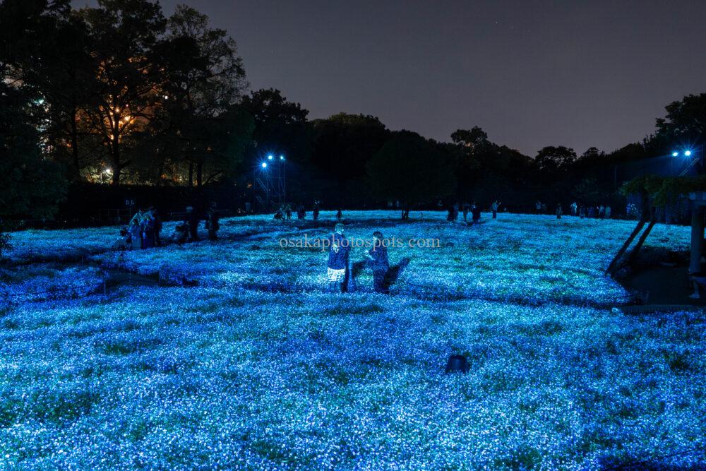 夜に開催されている「チームラボ・ボタニカルガーデン 大阪」では、ライフガーデンのライトアップが行われます。日中とは違い、宝石のように輝くネモフィラを撮影できます。