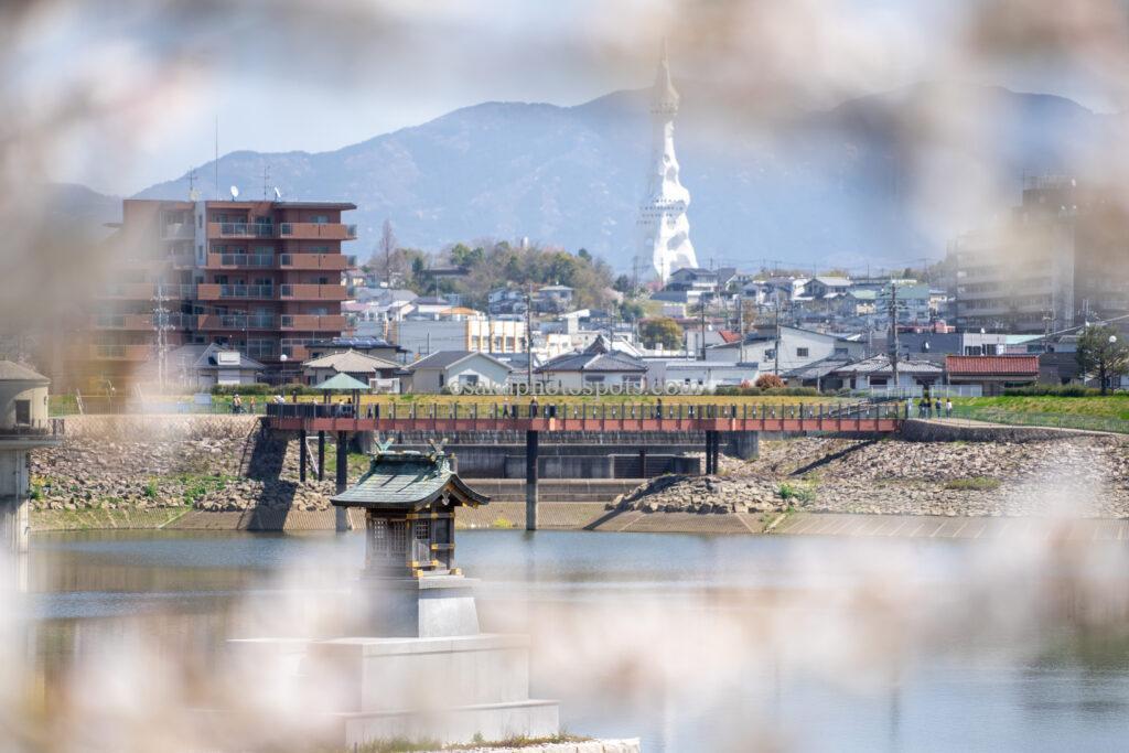 狭山池公園の西側からであれば、だいたいの場所からPLの塔が見えるので、桜を前ボケにつかってPLの塔を撮影することもできます。いろんな場所からPLの塔を主題にした1枚を撮影してみても面白いかもしれません。