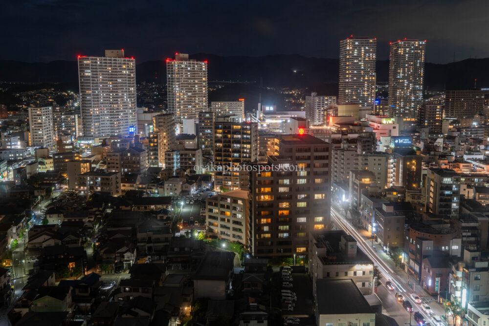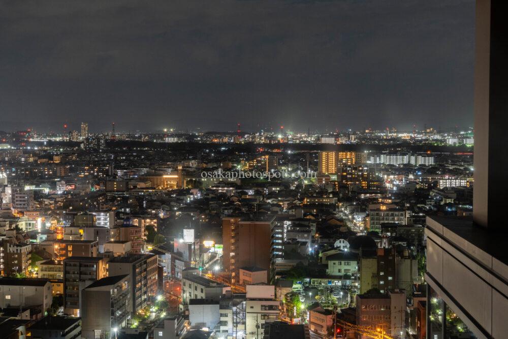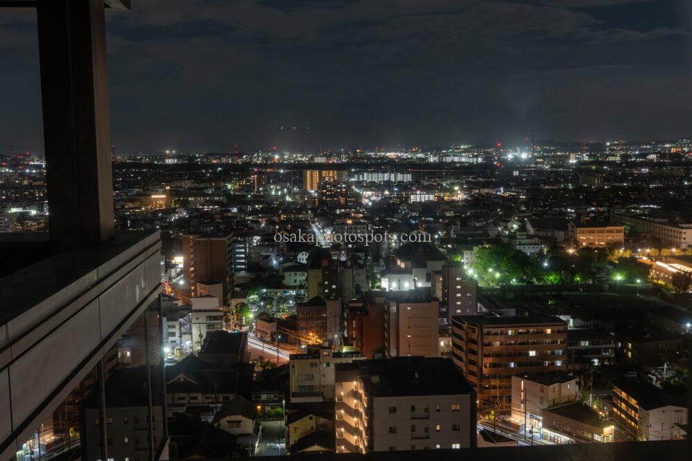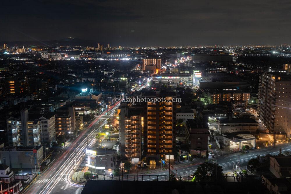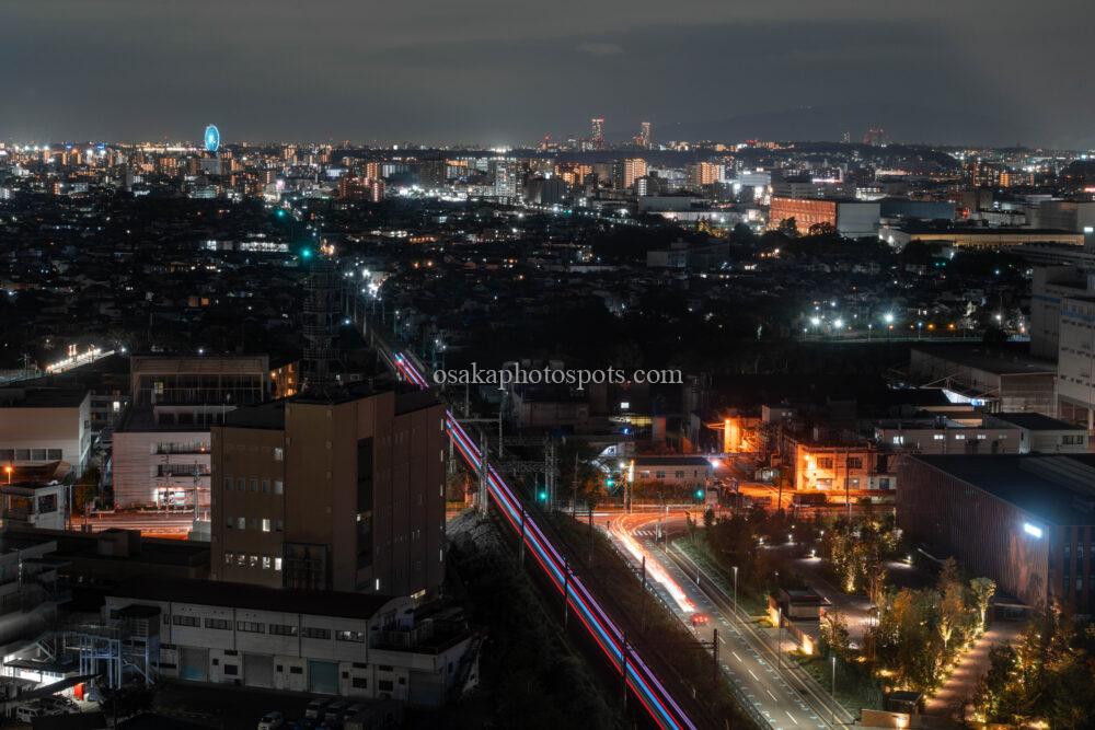 南側には寝屋川や枚方、大阪市方面の夜景が広がります。こちらは手前に大きな建物がないので、遠くまで見渡せます。望遠レンズがあれば、あべのハルカスも撮影できるようです。