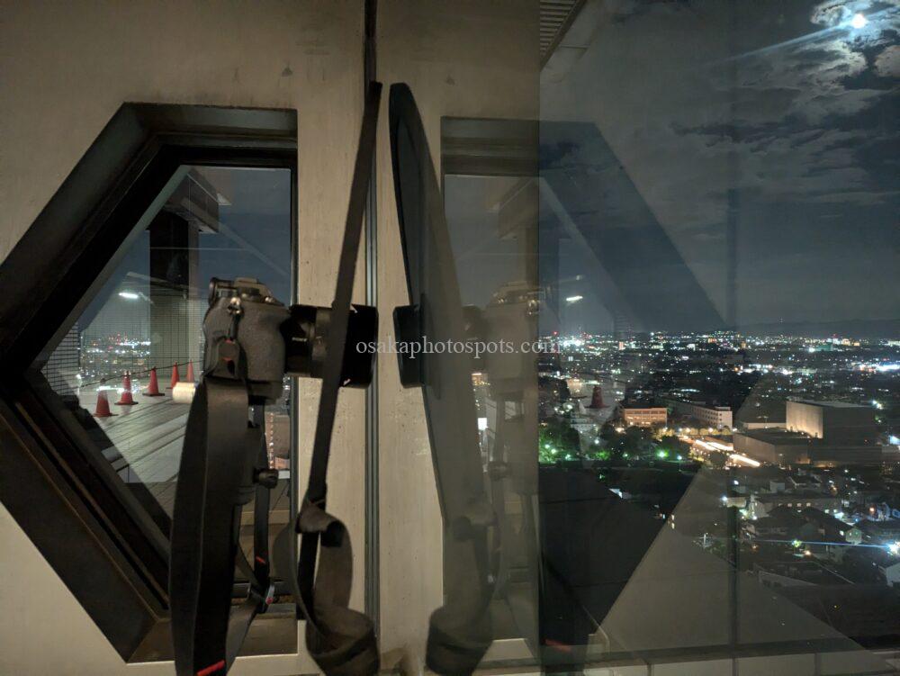 高槻市役所総合センターR階展望フロアは、屋内の展望施設なので、ガラスの映り込み防止に忍者レフや暗幕(黒い幕や布)を用意しておくのがおすすめです。忍者レフなしで夜景撮影しようとしましたが、結構映り込みました。(撮った写真を見ると、使用しても一部映り込みが見られましたが……。)