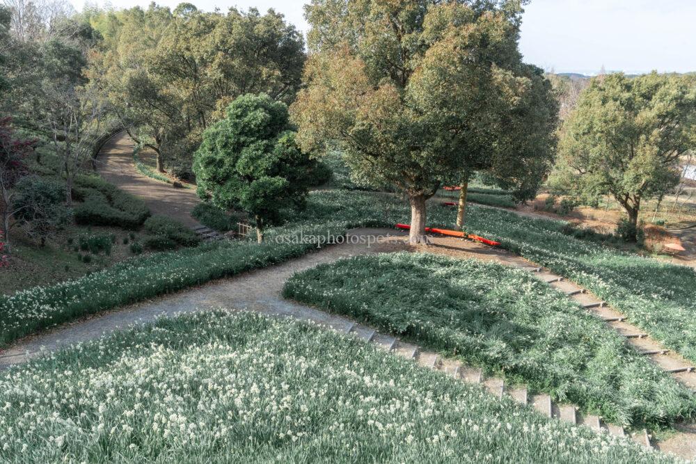 水仙郷があるのは、蜻蛉池公園の東側(ファミリーマートの近く)。1月~2月に見頃を迎えると、水仙郷の斜面を水仙が埋め尽くします。撮影する被写体が少ない時期のなか、おすすめできる花の撮影スポットです。