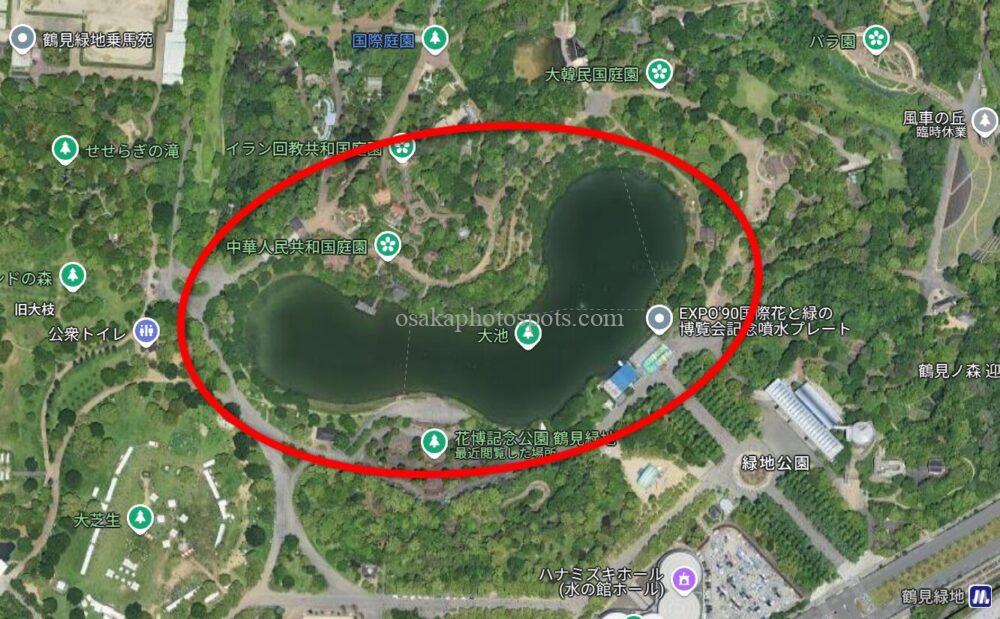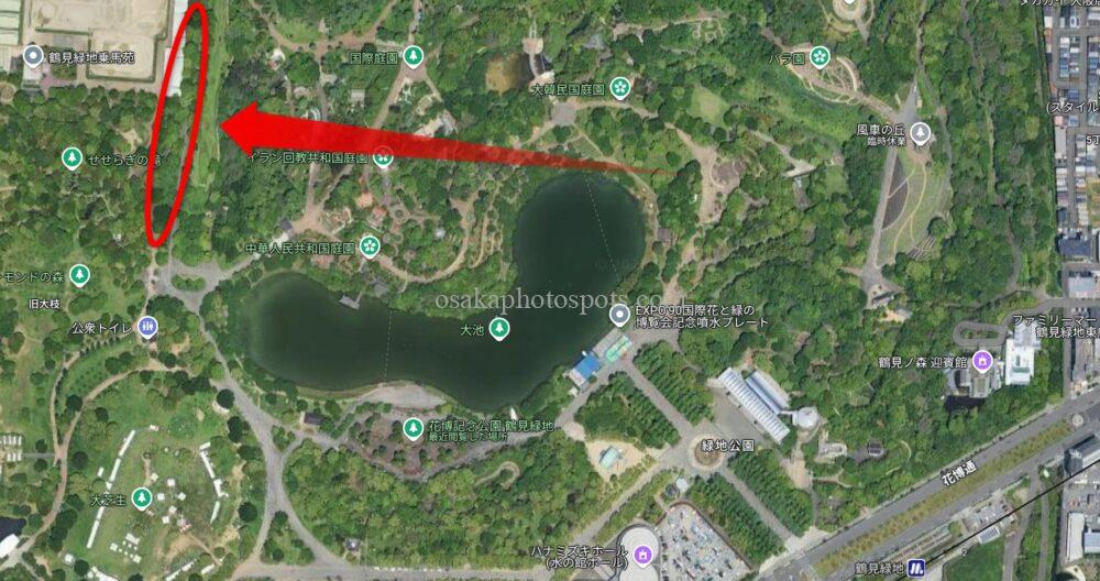 オカメザクラが咲いている場所は、以下のとおり、大池の北西側に位置しています。
