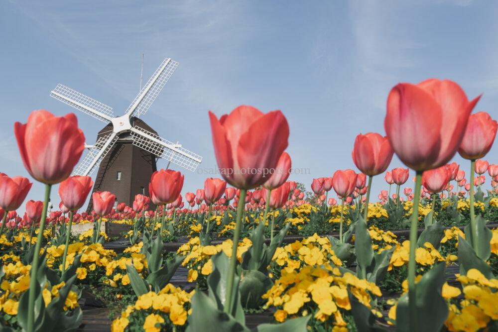 チューリップは、花博記念公園鶴見緑地の山エリアに位置する風車の丘で咲いています。例年4月上旬頃に見頃のピークを迎えることが多いです。風車を背景に入れることで、オランダの風景を思わせる1枚を撮影できます。
