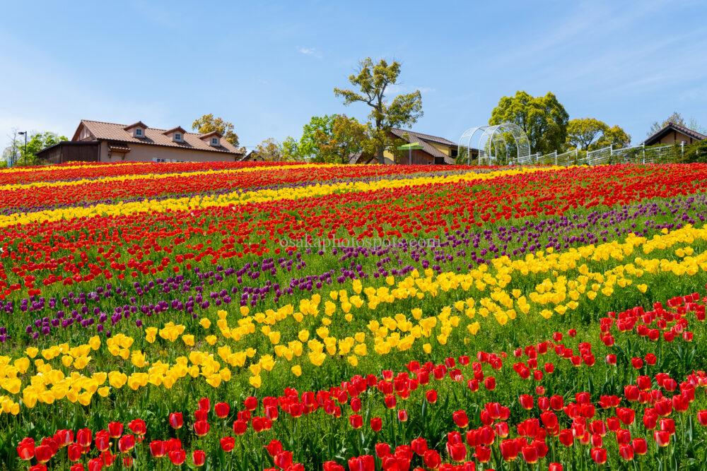 和泉リサイクル環境公園が最も華やかになるのが、4月〜5月上旬のチューリップが咲く時期。園内の花の農園に、チューリップがラインごとに色分けされて植えられ、グラデーションのような美しい景観を撮影できます。