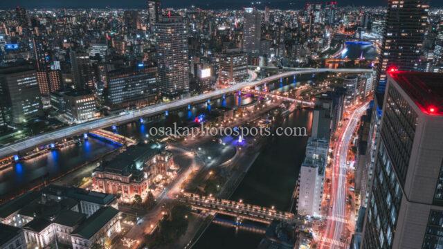 ウッドデッキの展望スペースからは、御堂筋や土佐堀川沿いを撮影可能。大阪・光の饗宴の御堂筋イルミネーションを撮影する人も多いです。