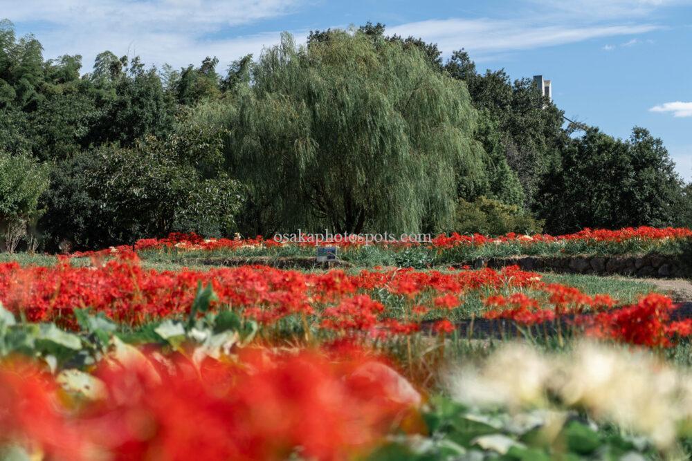 例年9月には、園内で彼岸花が見頃を迎えます。正確な数は不明ですが、大阪府内では規模の大きな彼岸花の群生地なので、1度はチェックしてみるのがおすすめです。