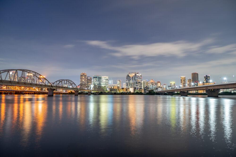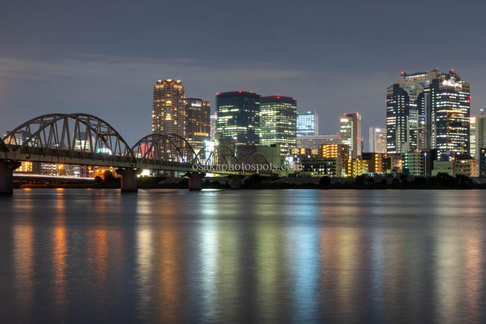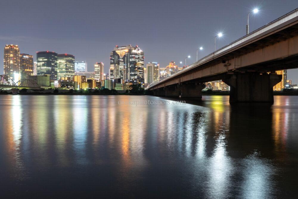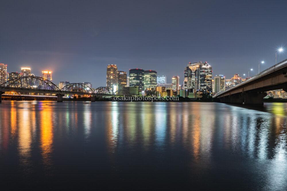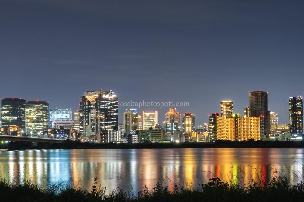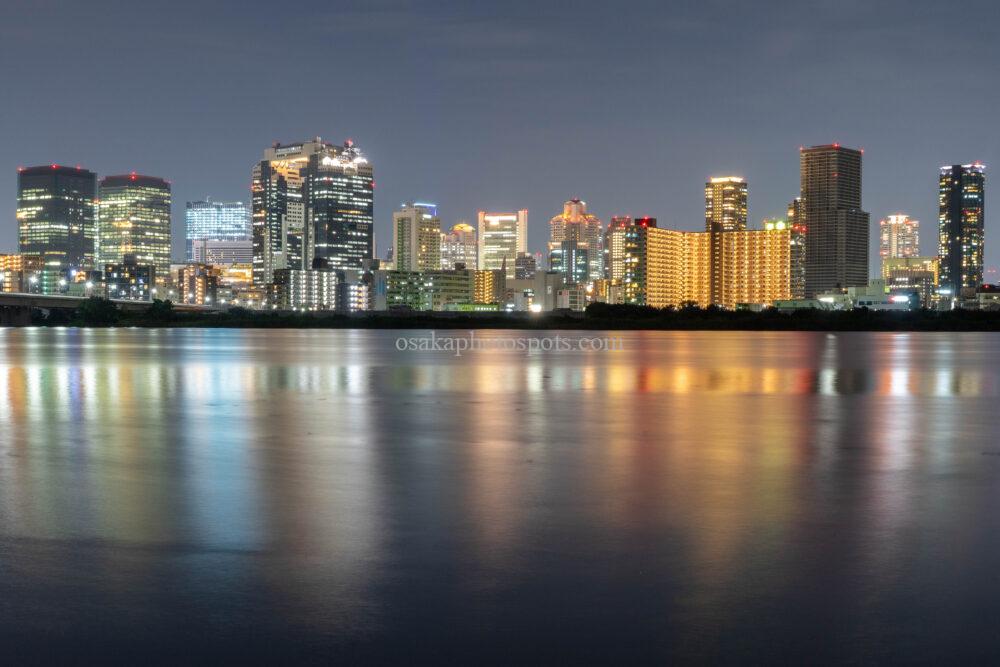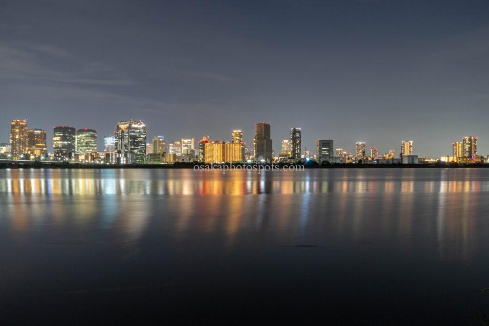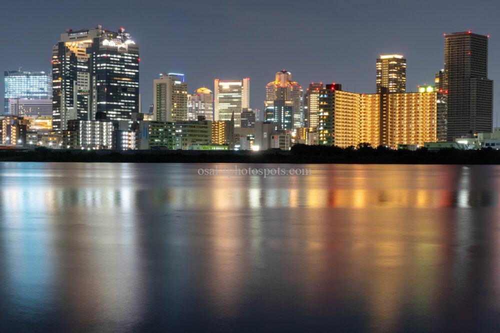 撮影場所は、淀川河川公園(十三野草地区)の南西側。なにわ淀川花火大会の会場付近です。このあたりからなら、梅田スカイビルをはじめとするビル群を撮影できます。